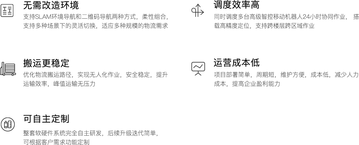 方案围绕仓储自动化、货源流通优化、降本增效等目标,综合利用高级智控移动机器人、物联网等先进技术手段,依托SUP-自主智控系统和云枢S7 RDS车辆调度系统,安全高效完成多种业务作业,有效提升物流工作效率和自动化水平。